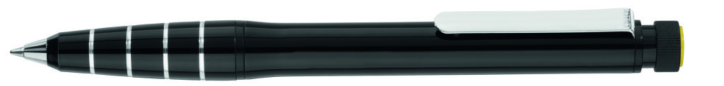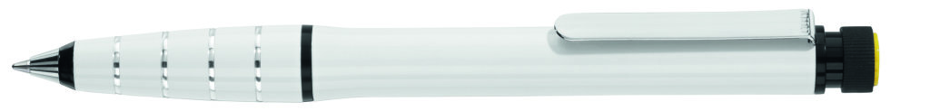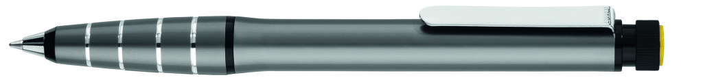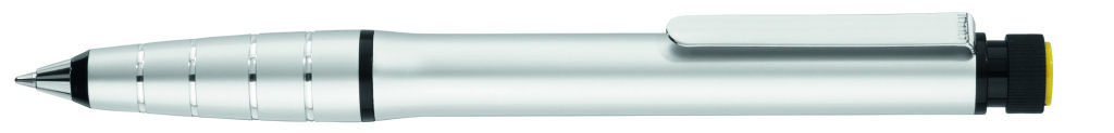 Metall-Drehkugelschreiber aus Aluminium mit integriertem gelb schreibenden Textmarker im Schaft. Der Textmarker lässt sich mittels Drehbewegung aus dem Schaft herausnehmen und kann separat genutzt werden. Minenfarbe: blau