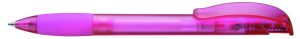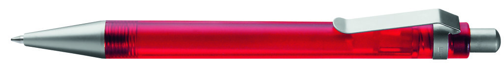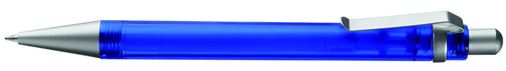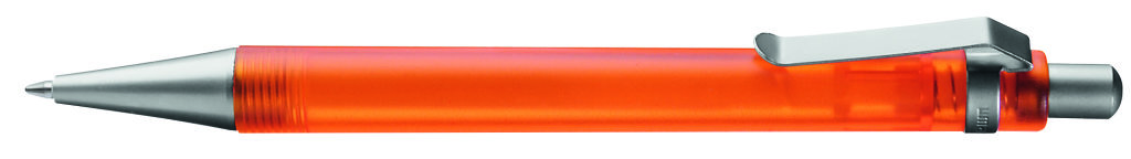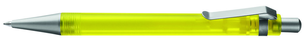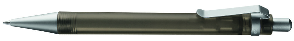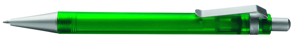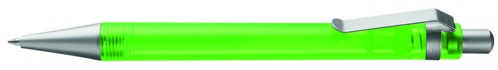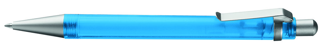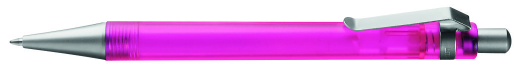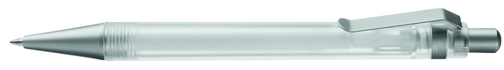 Druckkugelschreiber mit transparent gefrostetem oder gedecktem Gehäuse. Metalldrücker, Metallclip und Metallspitze matt verchromt. Minenfarbe: schwarz