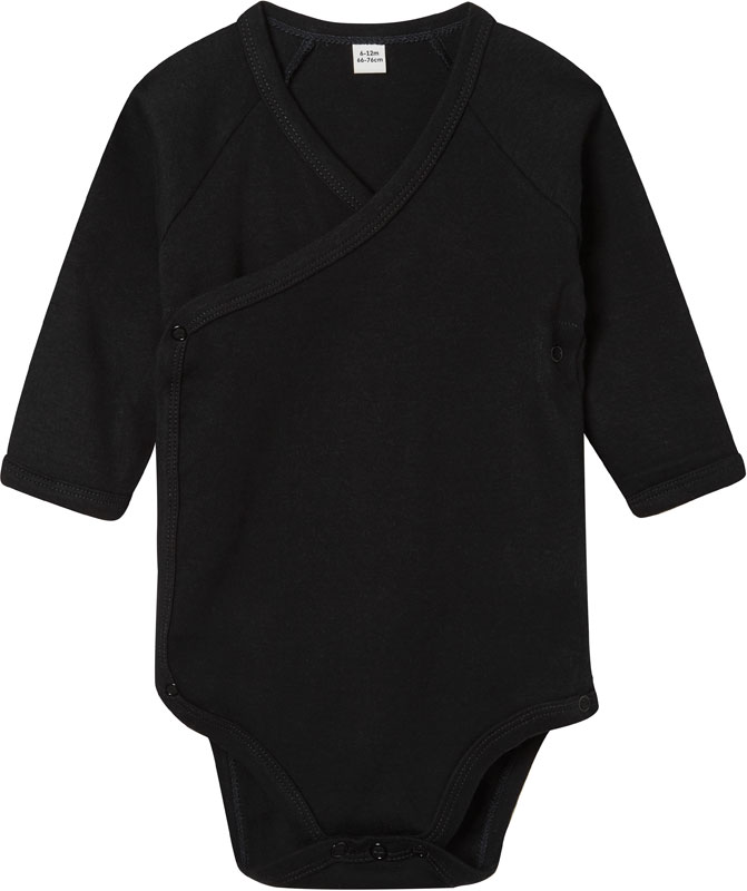 Baby Wickelbody langarm, Einfassung an Ärmeln, Ausschnitt und Bein, QR Code im Label zur Nachverfolgung der Lieferkette, Raglanärmel, nickelfreie Druckknöpfe an der Seite und Beinöffnung, hergestellt in Afrika, TearAway Label, 40° waschbar, Material: 200g/m², 100% gekämmte ringgesponnene zertifizierte Bio-Baumwolle, Interlock, Größen: 0-3,3-6,6-12