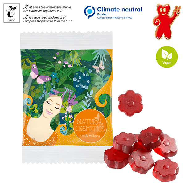 Vegane Fruchtgummi-Pastillen zum Lutschen, mit Aromen und färbenden Pflanzenauszügen, mit Himbeergeschmack, Gummi arabicum und Dr. Bach’s Original Bachblüten®-Essenz, ohne Gelatine, in transparentem alternativ weißem kompostierbarem Werbetütchen verpackt.
