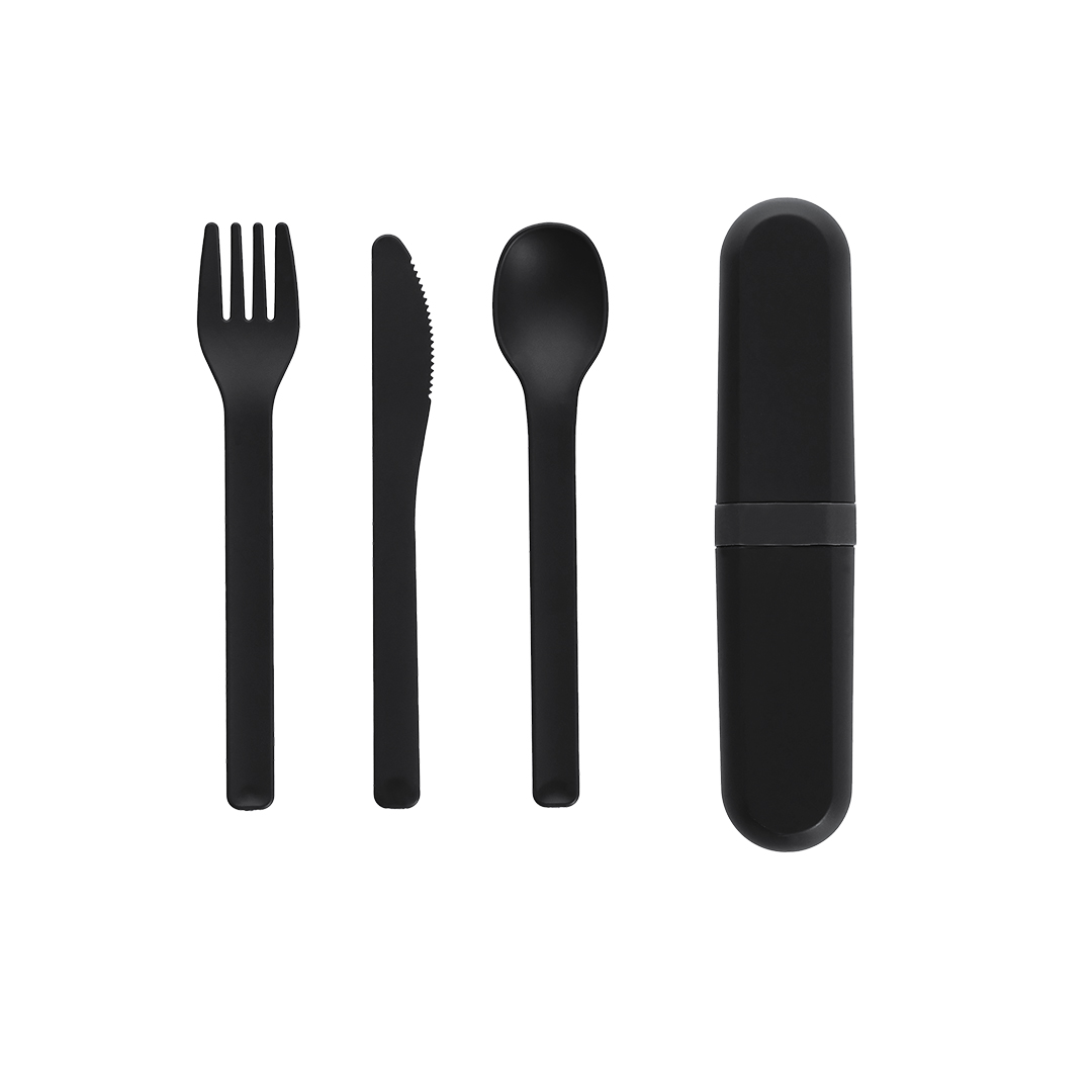 Set Besteck aus PLA, in passendem Präsentationskasten. Das Gehäuse verfügt über ein Push-Closure-System für zusätzliche Sicherheit. Dieses komplette Set enthält Löffel, Gabel und Messer.
