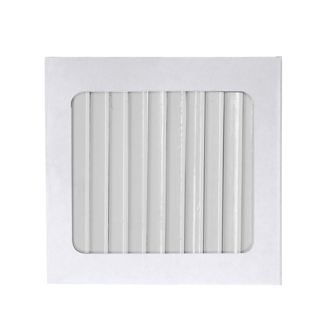Schachteln mit 12 weißen Holzstiften, mit sechseckigem Korpus und Stiften in verschiedenen Farben. Präsentiert in einem Pappetui mit Klappenverschluss. Speziell für digitale Gravur entwickelt.