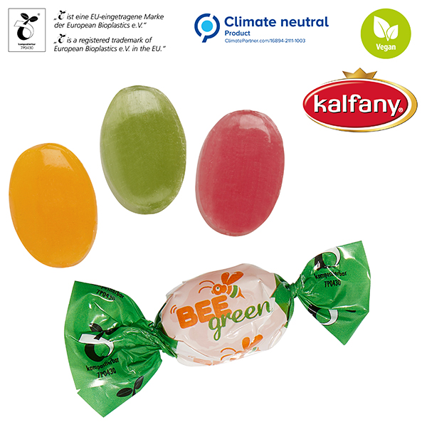 Bonbon im kompostierbaren Werbewickel aus glasklarer alternativ weißer Folie einzeln gewickelt.