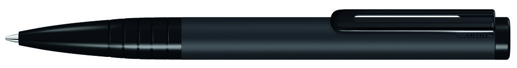 Metall-Drehkugelschreiber mit mattem Gehäuse. Clip, Spitze mit eingelassener Griffzone und Stopfen in schwarz glänzend. Minenfarbe: blau