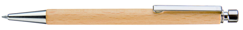 Holz-Druckkugelschreiber mit Metalldrücker, Metallclip und Metallspitze silber glänzend. Schaft aus schutzlackiertem PEFC-zertifiziertem Buchenholz. Hier geht´s zum [[https://www.youtube.com/watch?v=9Yy6g1ujeBE|Video]]. Minenfarbe: schwarz