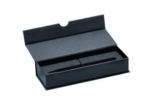 Zweiteiliges, schweres Pappetui in schwarz mit abnehmbarem Deckel, eingelassener Ziernaht in schwarz, schwarz glitzernd oder silber glitzernd, Kisseneinlage für ein oder zwei Schreibgeräte.