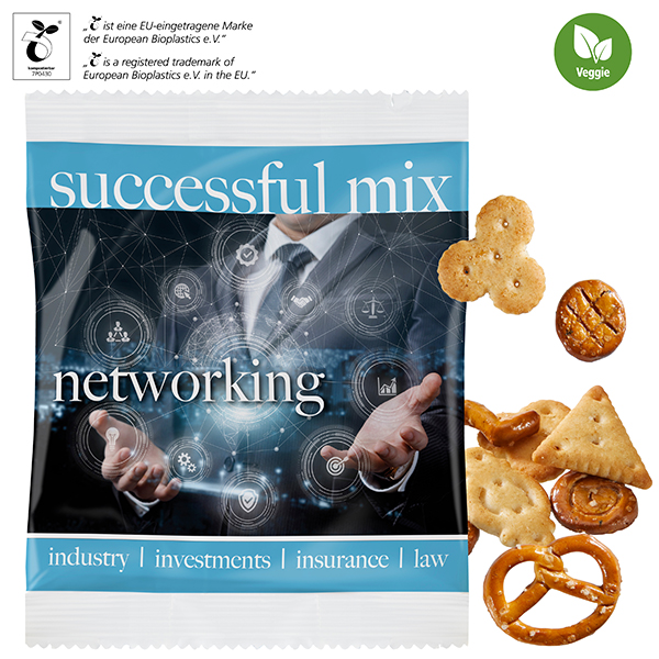 Cocktail-Mix aus Laugengebäck und Crackern in verschiedenen Motiven, gemischt in alubedampftem alternativ weißem kompostierbarem Werbetütchen verpackt.