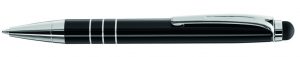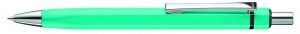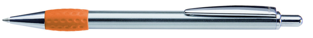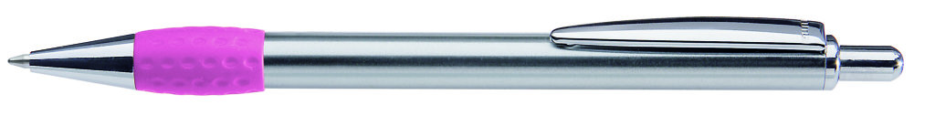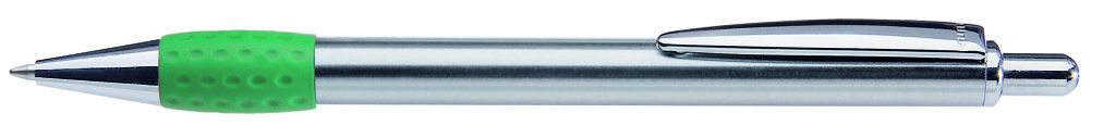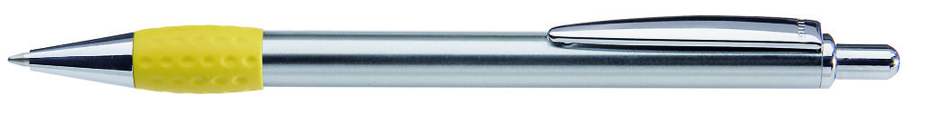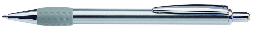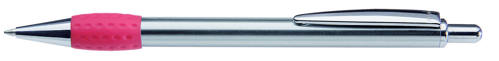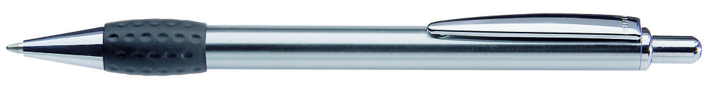Metall-Druckkugelschreiber mit Schaft, Drücker, Clip und Spitze glanzverchromt. Gummigriffzone farbig. Minenfarbe: schwarz