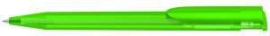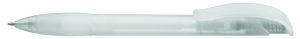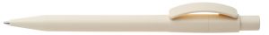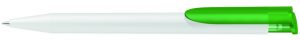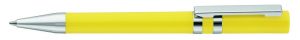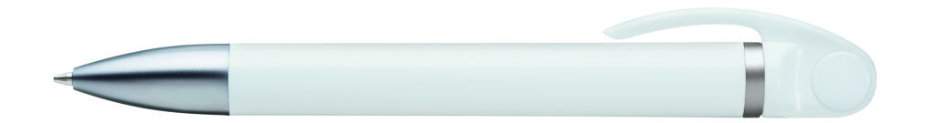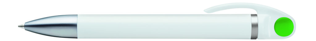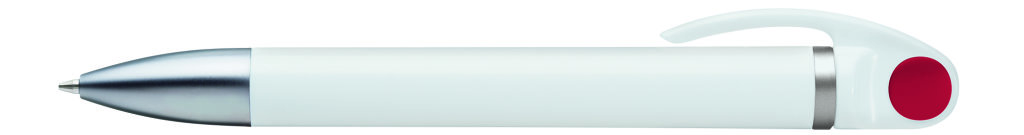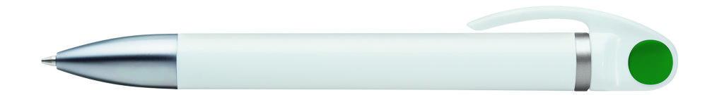 Drehkugelschreiber mit gedeckt glänzendem Gehäuse in schwarz oder weiß, farbig rundem DOT, silber mattem Zierring und schwere Metallspitze matt verchromt. Minenfarbe: blau