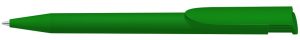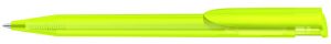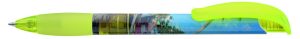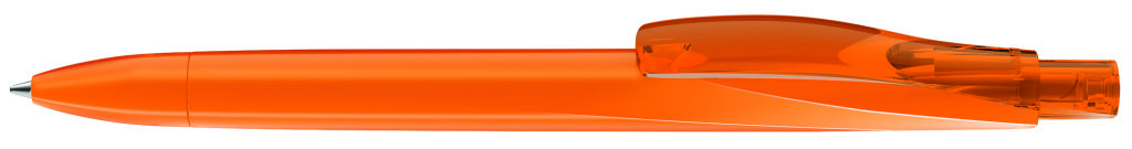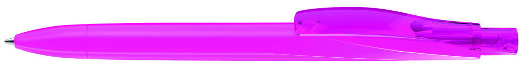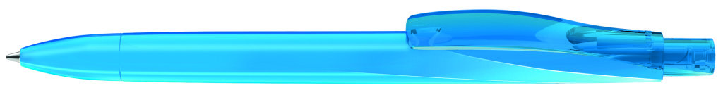Druckkugelschreiber mit geometrisch wechselnder Schaftform und gedeckt glänzendem Gehäuse, Clip und Drücker transparent glänzend. Minenfarbe: blau
