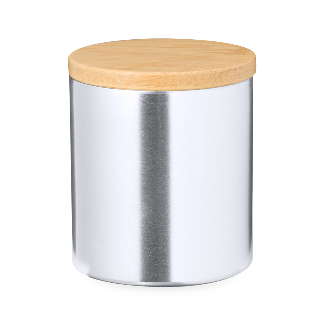 Vanille-Duftkerze. Präsentiert in einem Metallgefäß mit Bambusdeckel. Glas in vielen Farben erhältlich, mit Metalloberfläche. Einzeln präsentiert in einer Kraft-Design-Box. Materialien wie Bambus fördern die Verwendung natürlicher Rohstoffe und reduzieren den Schadstoffausstoß.