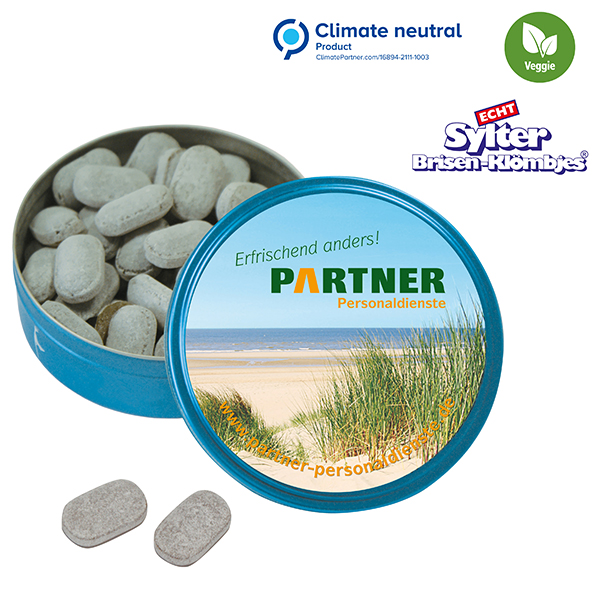 Metalldose rund mit weißem Deckeldruckbereich, wiederbefüllbar, Dosenboden und -rand im „Echt Sylter Brisen Klömbjes“-Design.