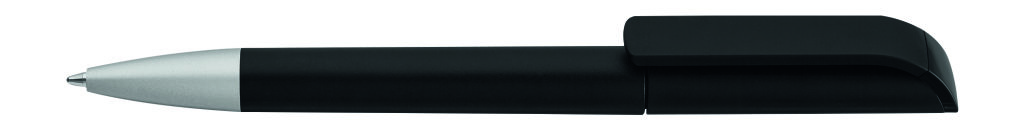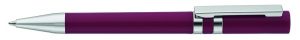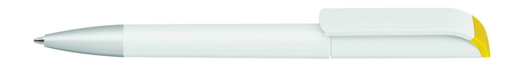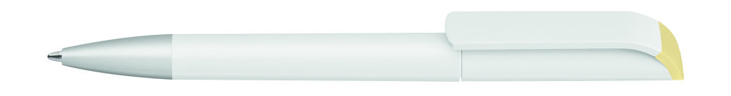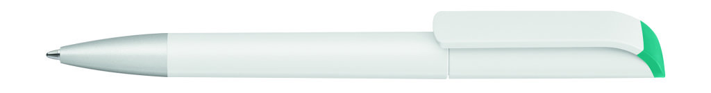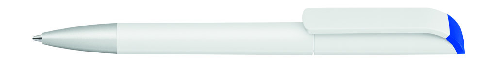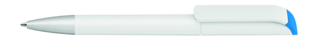 Drehkugelschreiber mit gedeckt mattem Gehäuse in weiß, farbig glänzendem Stopfen und Spitze silber matt. Minenfarbe: blau