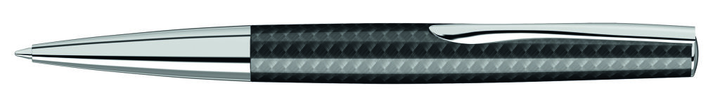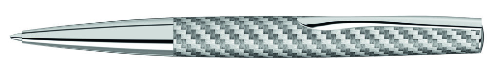 Metall-Drehkugelschreiber mit Schaft aus Carbonfaser in schwarz oder silber, gefederter Metallclip und schwere Metallspitze glanzverchromt bzw. Schaft aus Carbonfaser in schwarz, Metallclip und schwere Metallspitze schwarz matt lackiert und Softdrehmechanik. Minenfarbe: blau