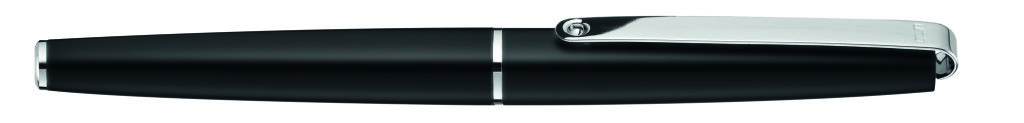 Metall-Rollerball mit glänzendem Gehäuse. Langer flexibler Metallclip, Zierring und Stopfen glanzverchromt. Griffzone gerillt glanzchromt. Minenfarbe: blau