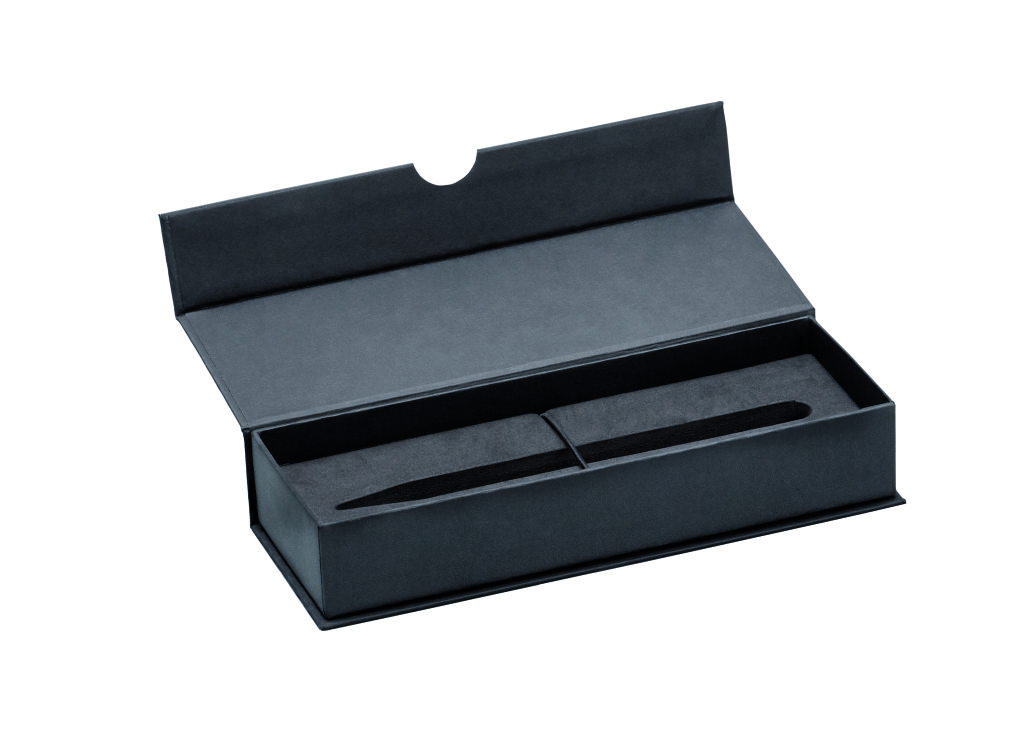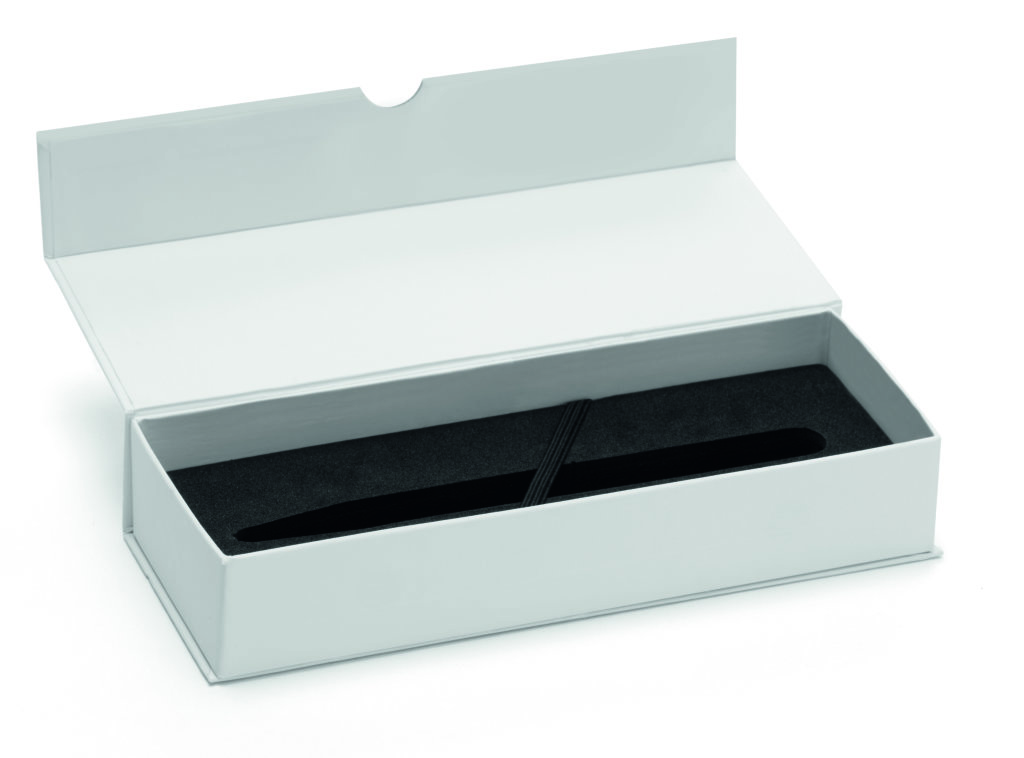 Klappetui in uni weiß oder schwarz mit Magnetverschluss für ein oder zwei Schreibgeräte. Kartonschuber in weiß. Auf Anfrage ist der Kartonschuber mit 4c-Gestaltung erhältlich.