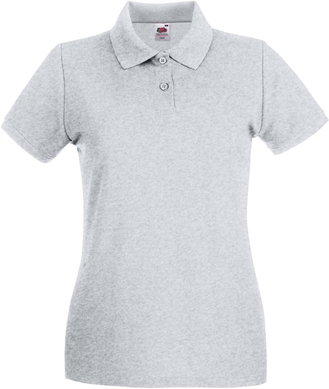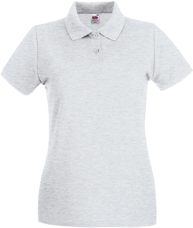 Damen Piqué Polo, Taillierter Schnitt, 2er Knopfleiste mit Knöpfen Ton-in-Ton, flacher Rippstrickkragen, Rippstrickbündchen am Ärmel, Seitenschlitze, 40° waschbar, Material: 180g/m², 100% Baumwolle, ash: 90% Baumwolle, 10% Polyester, heather grey: 97% Baumwolle, 3% Polyester, Größen: XS,S,M,L,XL,XXL