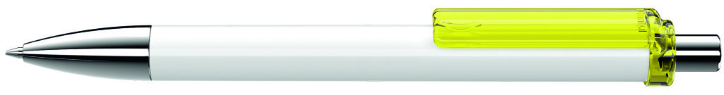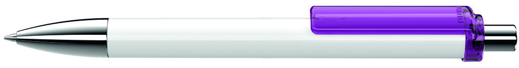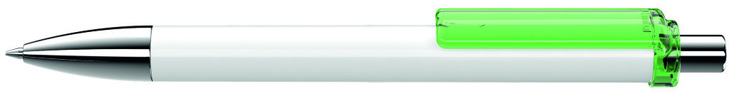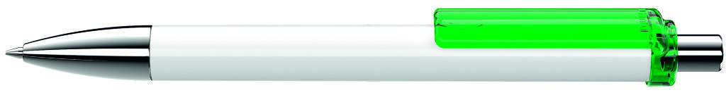 Druckkugelschreiber mit gedeckt glänzendem Schaft, transparent glänzendem Clip, Metallspitze und Metalldrücker glanzverchromt. Minenfarbe: blau