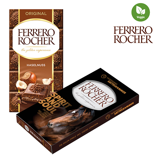 Rocher Schokoladentafel von Ferrero, in handelsüblicher Ausführung im Werbeschuber mit Sichtfenster auf die Marke.