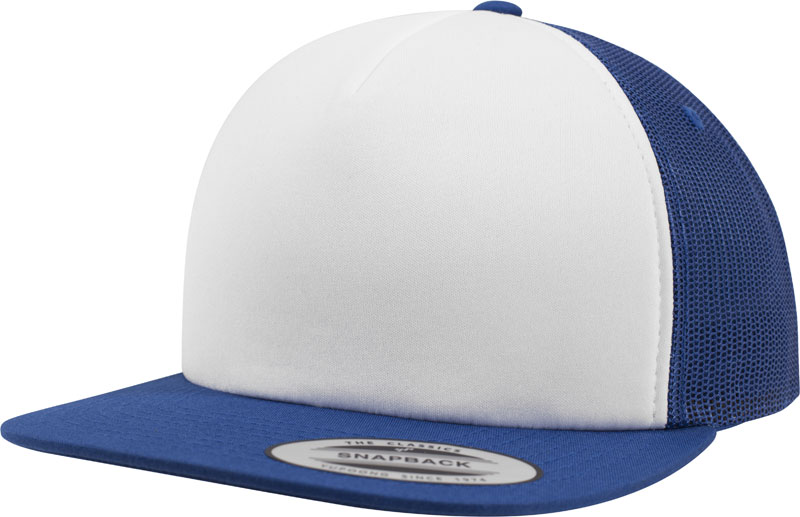 5 Panel Foam Trucker Kappe, Flacher Schirm, weiße Schaumstoff Kappenfront, Rückseite aus Netz, hohes Kappenprofil, Snapverschluss, nicht waschen, nicht bügeln, nicht trocknergeeignet, nicht chemisch reinigen, Material: Oberstoff 1: 100% Polyester, Interlock, Oberstoff 2: 100% Polyester, Größe: onesize