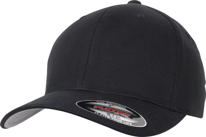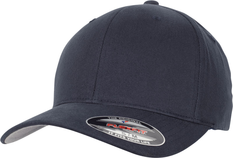 6 Panel Flexfit Kappe, Gebogener Schirm, silberne Schirmunterseite, geschlossene Rückseite ohne Verschluss, nicht waschen, nicht bügeln, nicht trocknergeeignet, nicht chemisch reinigen, Material: 98% gebürsteter Baumwoll-Twill, 2% Elasthan, Größen: S/M,L/XL