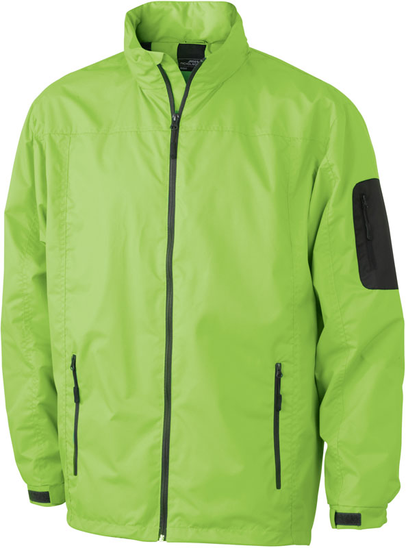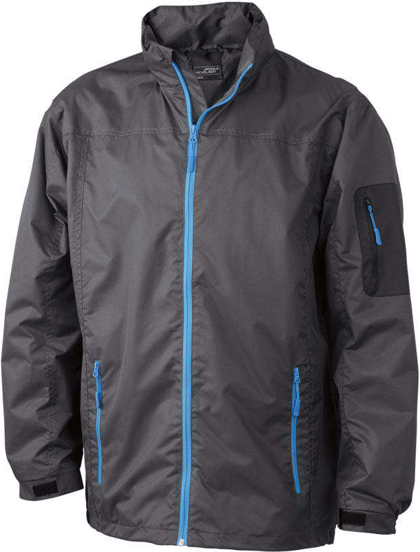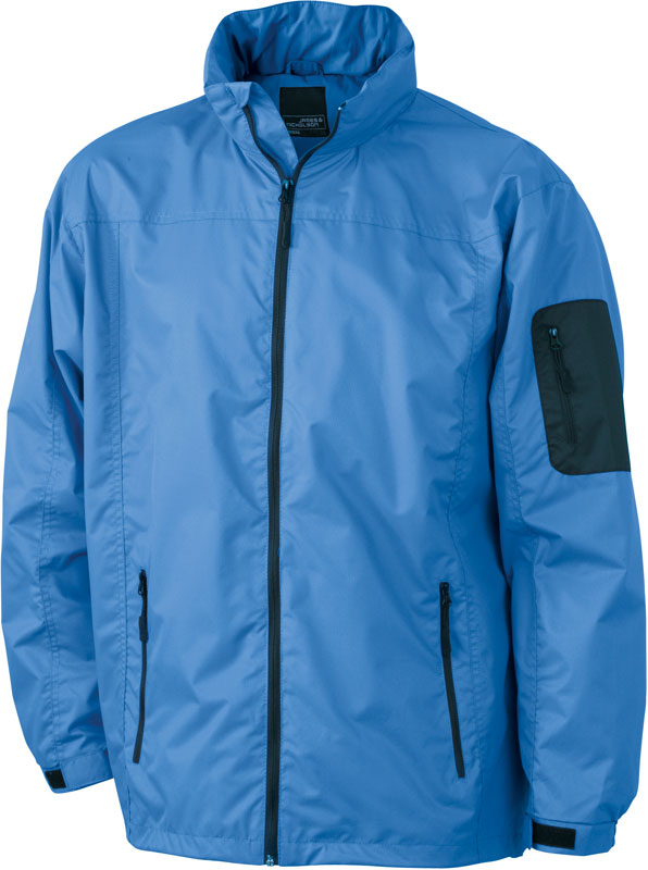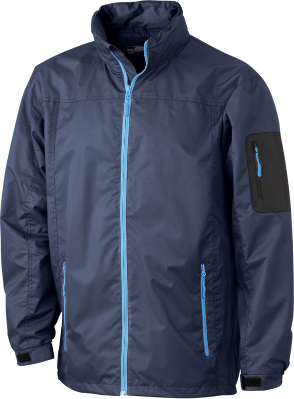 Herren Windbreaker, Wasserabweisend (1.500mm Wassersäule), im Kragen integrierte Kapuze, elastische Kordel mit Stopper an Kapuze und Saum, unterlegter Frontreißverschluss mit Kinnschutz, Reißverschlüsse und Ärmeltasche in Kontrastfarbe, Handytasche, 2 Seitentaschen mit Reißverschluss, Ärmeltasche und Innentasche mit Reißverschluss, Veredelungszugang am Rücken, winddicht, Reflexpaspel (ohne Schutzfunktion) am Kragen, 30° waschbar, Schonwäsche, nicht trocknergeeignet, Material: Außen und Mittelschicht: 100% Polyester, Ripstop Gewebe mit TPU-Beschichtung, Größen: S,M,L,XL,XXL,3XL
