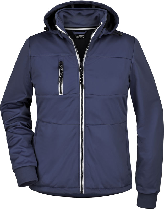 Damen 3-Lagen Softshell Jacke Maritim, Leicht taillierter Schnitt, wind- und wasserdicht (5.000mm Wassersäule), atmungsaktiv und wasserdampfdurchlässig, Stehkragen, abknöpfbare Kapuze, elastische Kordel mit Stopper an Kapuze und Saum, Ärmelabschluss mit Strickbündchen, 2 Seitentaschen und 1 Brusttasche mit Reißverschluss, Nähte nicht versiegelt, Reißverschlüsse und seitliches Band in Kontrastfarbe, Veredelungszugang, 30° waschbar, Schonwäsche, nicht bügeln, nicht trocknergeeignet, Material: 290g/m², 100% Polyester, Größen: S,M,L,XL,XXL