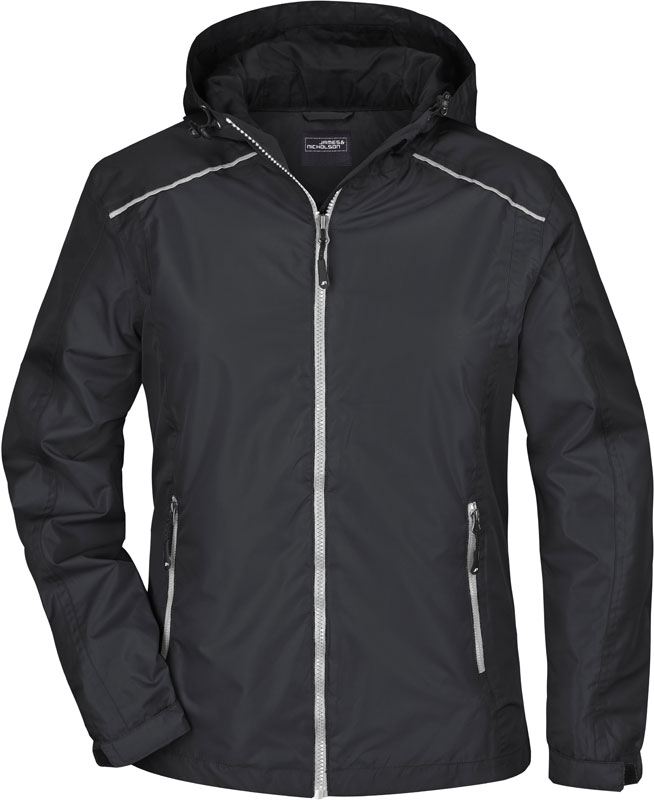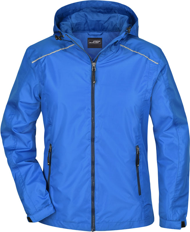 Damen Regenjacke, Taillierter Schnitt, wind- und wasserdicht (3.000mm Wassersäule) mit TPU-Beschichtung, atmungsaktiv (1.500g/m² in 24h), verstellbare Kapuze mit elastischer Kordel, Kinnschutz, 2 Seitentaschen mit Reißverschluss, Innentasche, Nähte versiegelt, Reißverschlüsse in Kontrastfarbe, Veredelungszugang am Rücken, reflektierende Details (ohne Schutzfunktion) an Kapuze, Vorder- und Rückenteil, 30° waschbar, Schonwäsche, nicht bügeln, nicht trocknergeeignet, Material: Außen: 100% Polyester, Innen: 100% Polyester, Größen: S,M,L,XL,XXL
