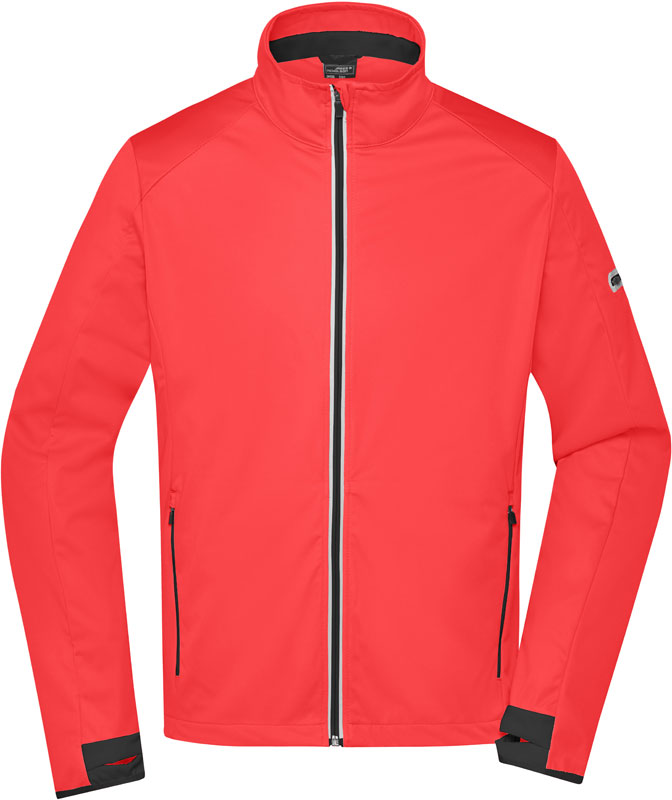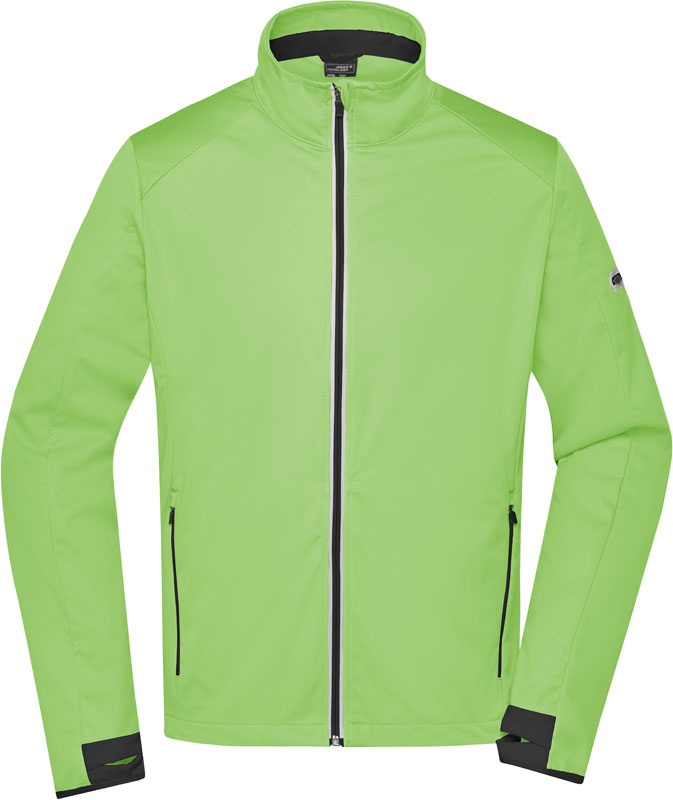 Herren 3-Lagen Sport Softshell Jacke, Leichtes elastisches 3-lagiges Funktionsmaterial mit TPU-Membran, wind- und wasserdicht (5.000mm Wassersäule), atmungsaktiv (5.000g/m² in 24h), Stehkragen, elastischer Armabschluss mit Daumenloch, hinterlegter reflektierender Frontreißverschluss mit Kinnschutz, 2 Seitentaschen mit Reißverschluss, 2 Innentaschen, Ärmeltasche und Rückenteil mit reflektierendem Druck (ohne Schutzfunktion), Nähte nicht versiegelt, länger geschnittener Rücken, 30° waschbar, Schonwäsche, nicht bügeln, nicht trocknergeeignet, Material: 180g/m², 100% Polyester, Größen: S,M,L,XL,XXL,3XL