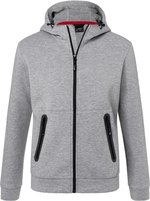 Herren Kapuzenjacke, Angeschnittene Kapuze mit Weitenregulierung, YKK Reißverschlüsse, aufgesetzte Kängurutasche mit Reißverschluss, elastische angenehme Interlock-Qualität, 30° waschbar, Schonwäsche, nicht bügeln, nicht trocknergeeignet, Material: 380g/m², 92% Polyester, 8% Elasthan, Größen: S,M,L,XL,XXL,3XL