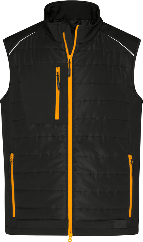 Herren Hybrid Gilet, 2-lagiges Softshellmaterial, wasser- und schmutzabweisend durch BIONIC-FINISH®ECO, Stehkragen, gesteppte Einsätze im Vorder- und Rückenteil, YKK Reißverschlüsse, durchgehend unterlegter 2-Wege Reißverschluss mit Windschutzblende und Kinnschutz, 1 Innentasche mit Klettverschluss, Brusttasche mit Reißverschluss, 2 Seitentaschen mit Reißverschluss, Veredelungszugang am Rücken, Reflexelemente (ohne Schutzfunktion), 30° waschbar, nicht bügeln, nicht trocknergeeignet, Material: 280g/m², Oberstoff 1: 100% recyceltes Polyester, Oberstoff 2: 100% recyceltes Polyester, Futterstoff: 100% recyceltes Polyester, Wattierung: 100% Polyester DuPont™ Sorona®, Größen: XS,S,M,L,XL,XXL,3XL,4XL,5XL,6XL