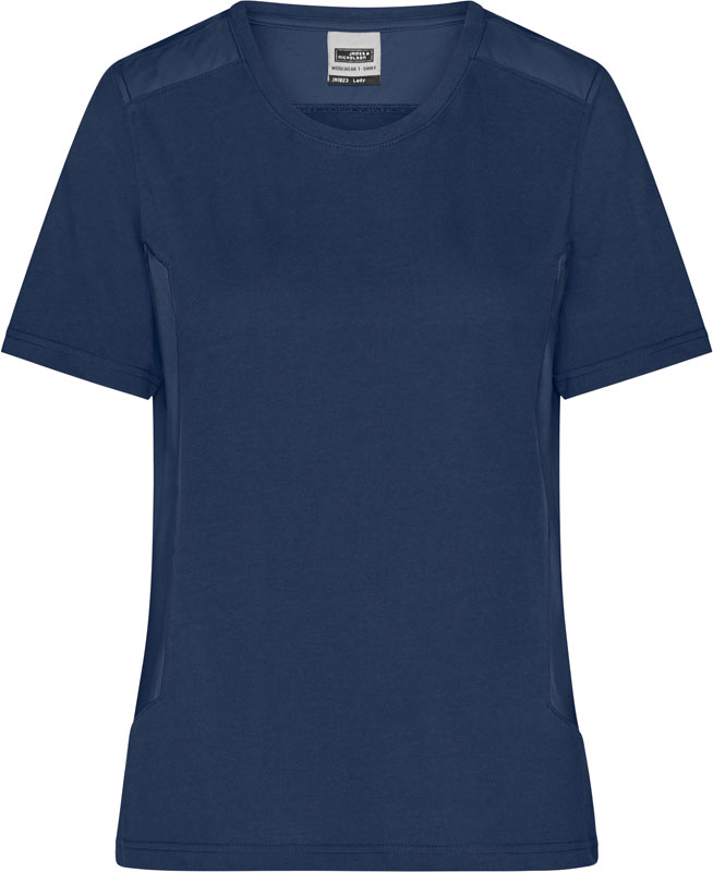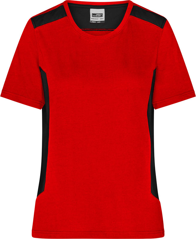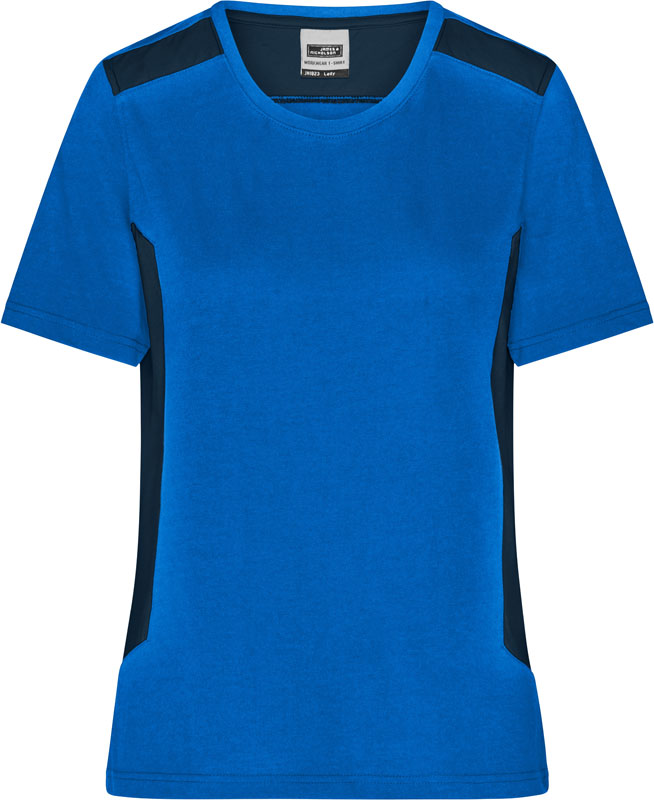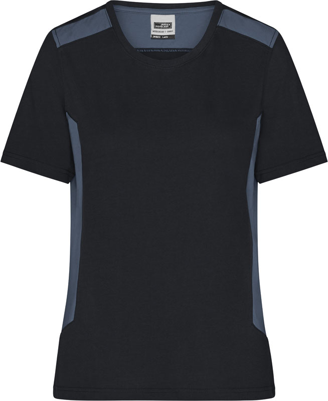 Damen Workwear T-Shirt – Strong, Leicht taillierter Schnitt, Rundhalsausschnitt mit Elasthan, Nackenband, Einsätze in Kontrastfarbe an Seite und Schulter, strapazierfähig, 60° waschbar, trocknergeeignet bei niedriger Temperatur, Material: 180g/m², 50% recyceltes Polyester, 50% gekämmte ringgesponnene zertifizierte Bio-Baumwolle, Größen: XS,S,M,L,XL,XXL,3XL,4XL