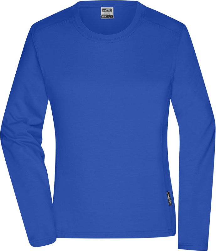 Damen Workwear T-Shirt langarm, Leicht taillierter Schnitt, Nackenband, Passe an Schulter und Rückenteil, Bündchen am Hals mit Elasthan, UV-Schutz 50+, 60° waschbar, trocknergeeignet bei niedriger Temperatur, Material: 180g/m², 50% Polyester, 50% gekämmte ringgesponnene zertifizierte Bio-Baumwolle, Größen: XS,S,M,L,XL,XXL,3XL,4XL
