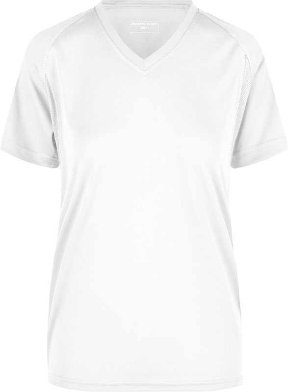 Damen Lauf Shirt, Leicht taillierter Schnitt, atmungsaktiv, V-Ausschnitt, Netzeinsätze in Kontrastfarbe, feuchtigkeitsregulierend und schnelltrocknend, leicht und komfortabel, Reflexdruck (ohne Schutzfunktion) im Rückenteil, 30° waschbar, nicht trocknergeeignet, Material: 140g/m², 100% Polyester, Größen: XS,S,M,L,XL,XXL