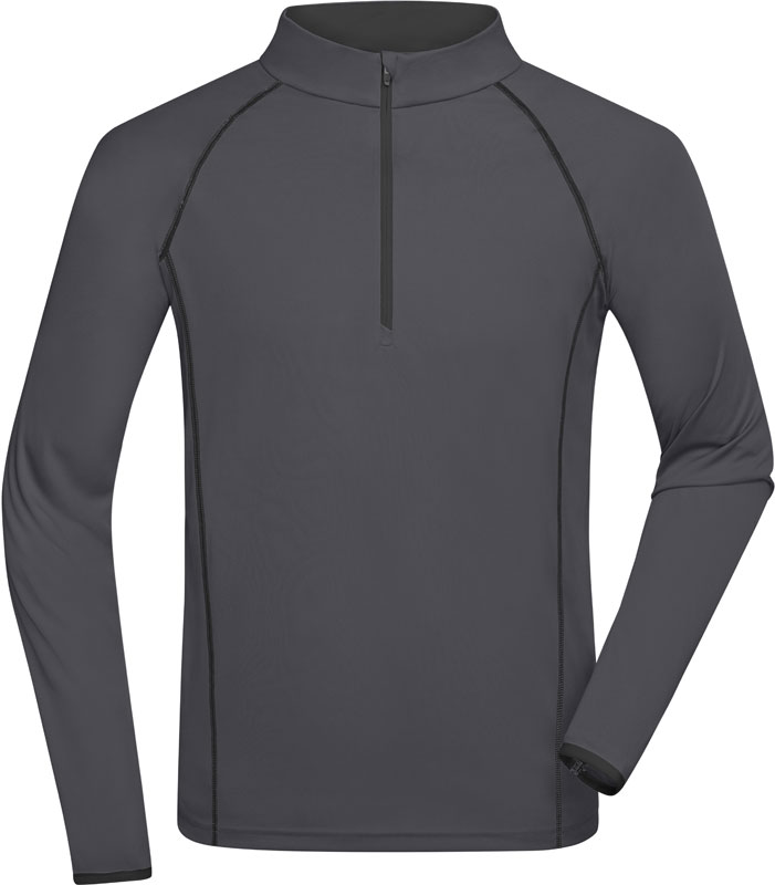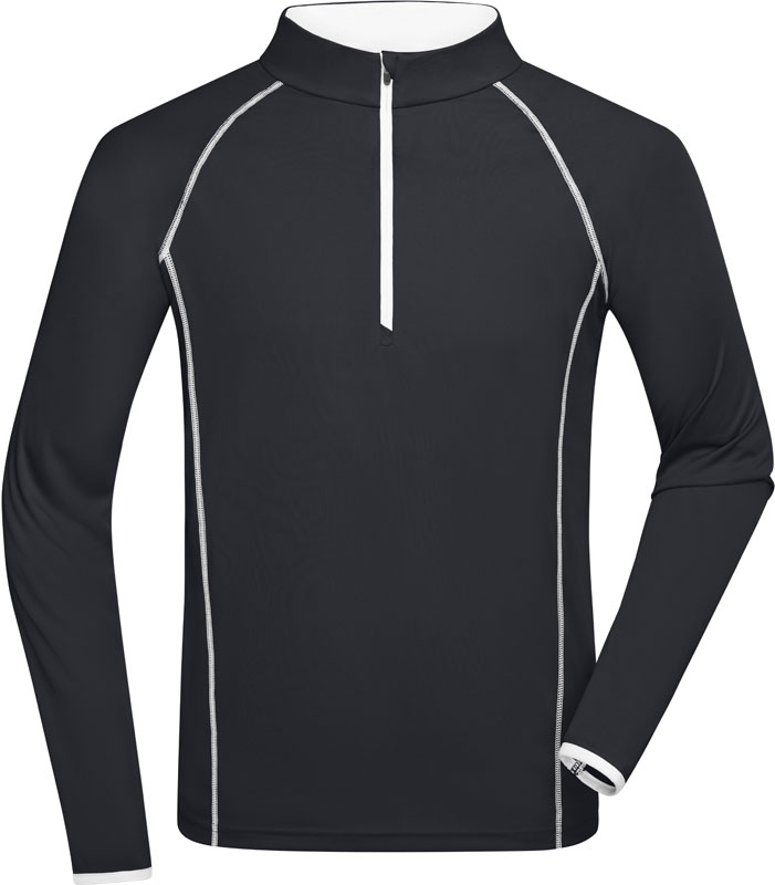 Herren Funktionsshirt langarm, Stehkragen, Kragen innen und Armabschluss in Kontrastfarbe, Raglanärmel, Reißverschluss mit Kinnschutz, Flatlock-Nähte in Kontrastfarbe im Vorder- und Rückenteil, 30° waschbar, nicht trocknergeeignet, Material: 130g/m², 100% Polyester, Größen: S,M,L,XL,XXL