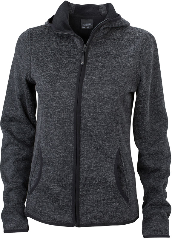 Damen Strickfleece Kapuzenjacke, Taillierter Schnitt, angeschnittene Kapuze, Bündchen in Kontrastfarbe, 2 Einschubtaschen im Vorderteil, figurbetonende Teilungsnähte, Melange-Optik, weiches, wärmendes, pflegeleichtes Material, 30° waschbar, Schonwäsche, nicht trocknergeeignet, Material: 320g/m², 100% Polyester, Außen: Strickoptik, innen angeraut, Größen: S,M,L,XL,XXL