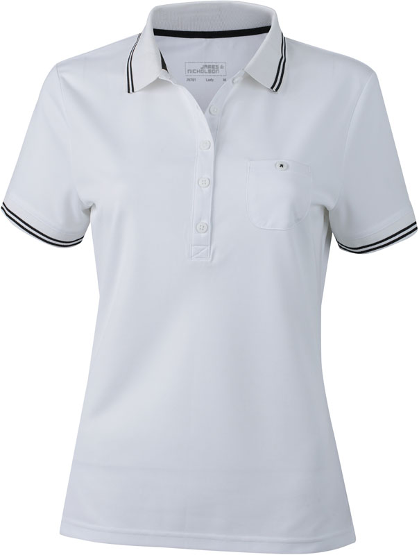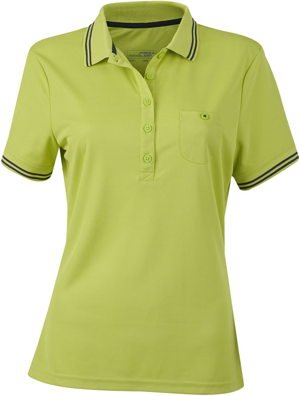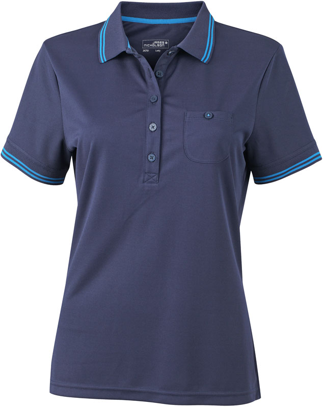 Damen Funktions Polo, Leicht taillierter Schnitt, atmungsaktiv, 5er Knopfleiste, Brusttasche mit Knopf, Seitenschlitze, Streifen in Kontrastfarbe an Strickkragen und Ärmelbündchen, Micropolyester, schnelltrocknend, 40° waschbar, Schonwäsche, nicht trocknergeeignet, Material: 160g/m², 100% Polyester, Größen: S,M,L,XL,XXL