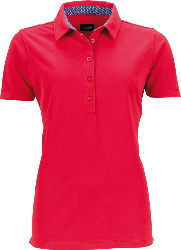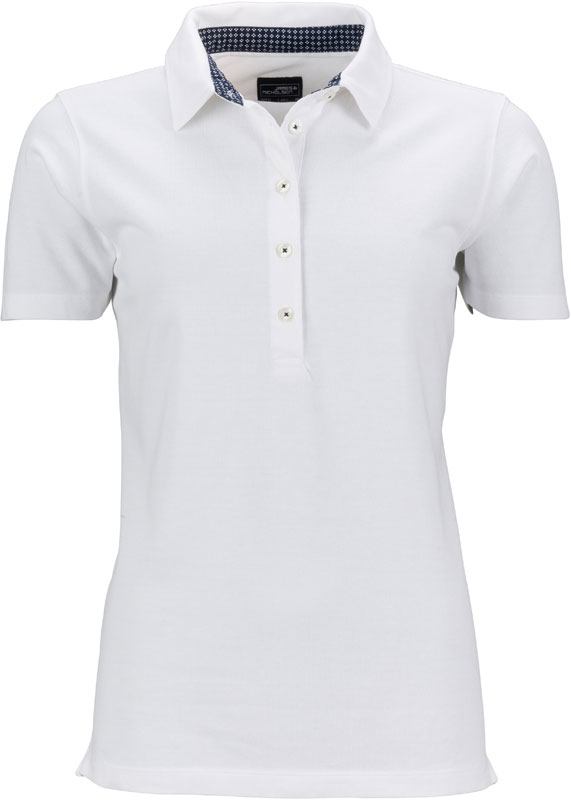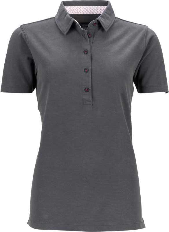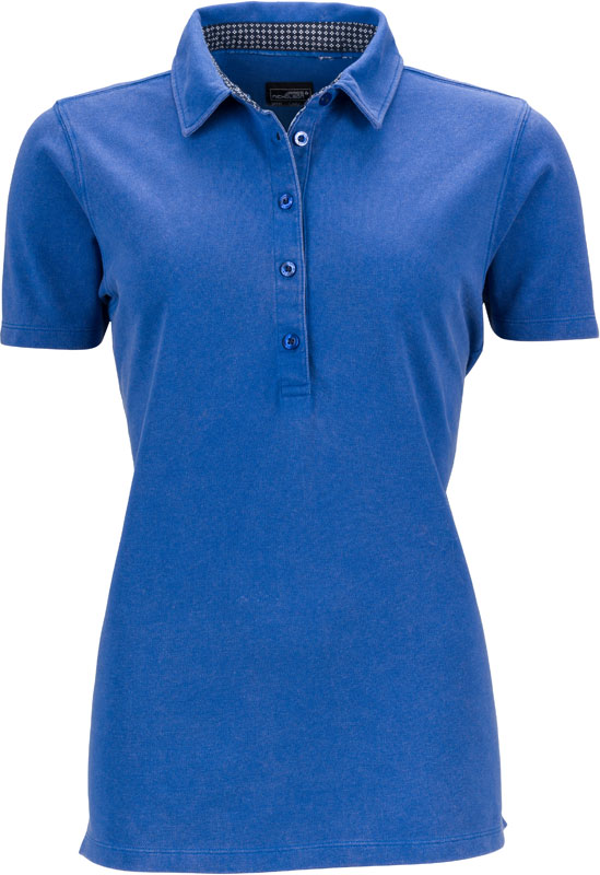 Damen Piqué Polo mit Kragenbesatz, Taillierter Schnitt, konfektionierter Kragen mit bedrucktem Besatz innen, 5 Knöpfe Ton-in-Ton, Seitenschlitze, 2-lagige Passe im Rücken, gewaschener Used-Look, 30° waschbar, nicht trocknergeeignet, Material: 190g/m², 100% Baumwolle, Größen: S,M,L,XL,XXL
