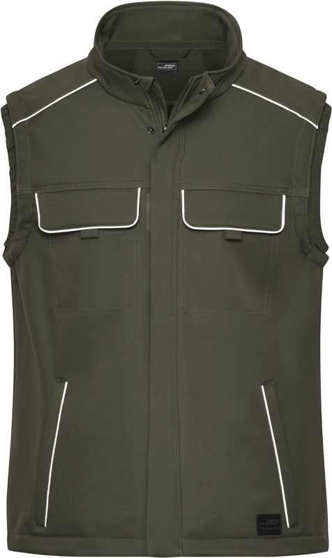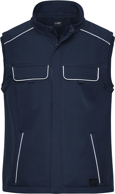 Workwear Softshell Gilet – Solid, Wind- und wasserabweisend (2.000mm Wassersäule), atmungsaktiv und wasserdampfdurchlässig (2.000g/m² in 24h), Stehkragen, elastischer Abschluss am Armausschnitt, durchgehend unterlegter Reißverschluss mit Windschutzblende und Kinnschutz, YKK Reißverschlüsse, Knöpfe und Reißverschlüsse verdeckt verarbeitet, Seitentaschen und Innentasche mit Reißverschluss, Brusttasche mit losem Taschenbeutel zur einfachen Veredelung, diverse Innentaschen, länger geschnittener Rücken, robustes und strapazierfähiges Softshellmaterial, Reflexelemente (ohne Schutzfunktion) an Taschen, Schulter und Rückenteil, 30° waschbar, nicht bügeln, nicht trocknergeeignet, Material: 320g/m², 100% Polyester, Innenfutter: Fleece, Größen: XS,S,M,L,XL,XXL,3XL,4XL,5XL,6XL