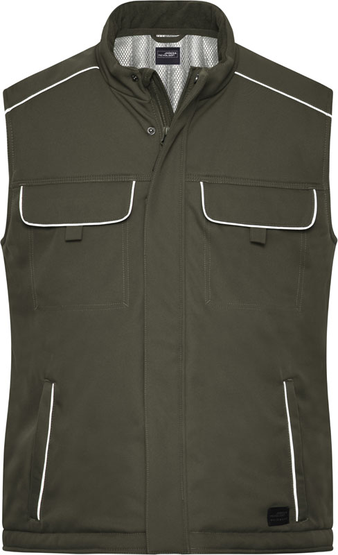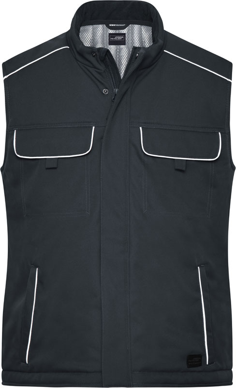 Workwear Softshell Padded Gilet – Solid, Wind- und wasserabweisend (2.000mm Wassersäule), atmungsaktiv und wasserdampfdurchlässig (2.000g/m² in 24h), Stehkragen innen mit weichem Fleece, durchgehend unterlegter Reißverschluss mit Windschutzblende und Kinnschutz, YKK Reißverschlüsse, Knöpfe und Reißverschlüsse verdeckt verarbeitet, Seitentaschen und Innentasche mit Reißverschluss, Brusttasche mit losem Taschenbeutel zur einfachen Veredelung, diverse Innentaschen, länger geschnittener Rücken, Veredelungszugang am Rücken, robustes und strapazierfähiges Softshellmaterial, Reflexelemente (ohne Schutzfunktion) an Taschen, Schulter und Rückenteil, 30° waschbar, nicht bügeln, nicht trocknergeeignet, Material: 100% Polyester, Wattierung: 100% Polyester, Futter: 100% Polyester, Größen: XS,S,M,L,XL,XXL,3XL,4XL,5XL,6XL