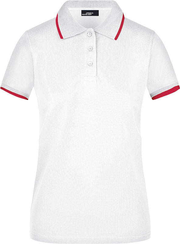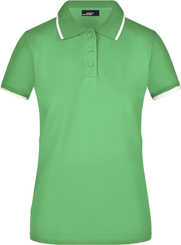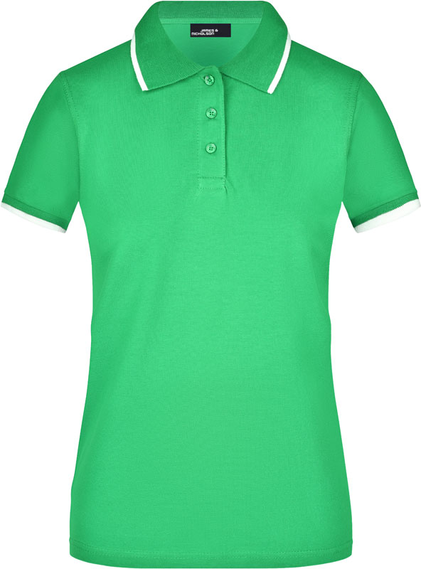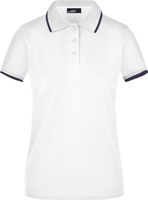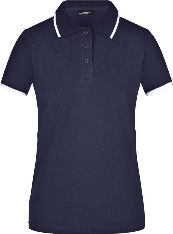 Damen Piqué Polo Tipping, Gestrickter Polokragen und Ärmelbündchen, Nackenband, Knöpfe Ton-in-Ton, Doppelnähte an Schultern, Ärmeln und Bündchen, Seitenschlitze, 40° waschbar, nicht trocknergeeignet, Material: 220g/m², 100% gekämmte ringgesponnene Baumwolle, Größen: S,M,L,XL,XXL
