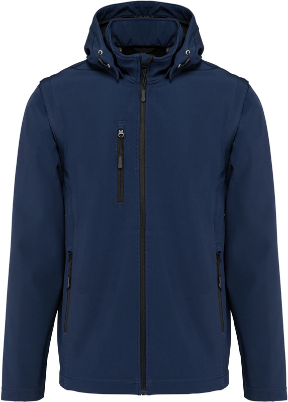 Unisex 3-Lagen Kapuzen Softshell Jacke, Schmale Passform, wasserdicht (8.000mm Wassersäule), atmungsaktiv (3.000g/m² in 24h), abnehmbare Kapuze mit Druckknöpfen und Kordelzug, abnehmbare Ärmel, 2 Seitentaschen und 1 Brusttasche mit Reißverschluss, Doppelnähte an Bündchen und Saum, 40° waschbar, nicht trocknergeeignet, nicht chemisch reinigen, Material: 300g/m², 95% Polyester, 5% Elasthan, Mittelschicht: atmungsaktive Membran, Innen: Microfleece, Größen: XS,S,M,L,XL,XXL,3XL,4XL,5XL