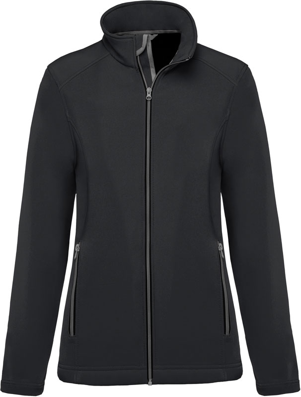 Damen 2-Lagen Softshell Jacke, Taillierter Schnitt, wasserabweisend, Stehkragen, 2 Seitentaschen mit Reißverschluss, länger geschnittener Rücken, Reißverschlüsse in Kontrastfarbe, 40° waschbar, trocknergeeignet bei niedriger Temperatur, Material: 300g/m², Außen: 95% Polyester, 5% Elasthan, Innen: 100% Polyester Microfleece, Größen: XS,S,M,L,XL,XXL,3XL