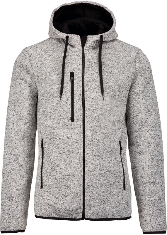 Herren Melange Kapuzen Strickfleece Jacke, Kapuze innen und Kordel in Kontrastfarbe, Ärmelbündchen und Saum in kontrastfarbenem Schrägband, Brusttasche, 2 Seitentaschen mit Reißverschluss, Überdecknaht an den Einsätzen, Reißverschlüsse in Kontrastfarbe, innen angeraut, 40° waschbar, nicht trocknergeeignet, nicht chemisch reinigen, Material: 345g/m², 100% Polyester, Kapuzenfutter: 100% Baumwolle, Single Jersey, Größen: S,M,L,XL,XXL,3XL,4XL