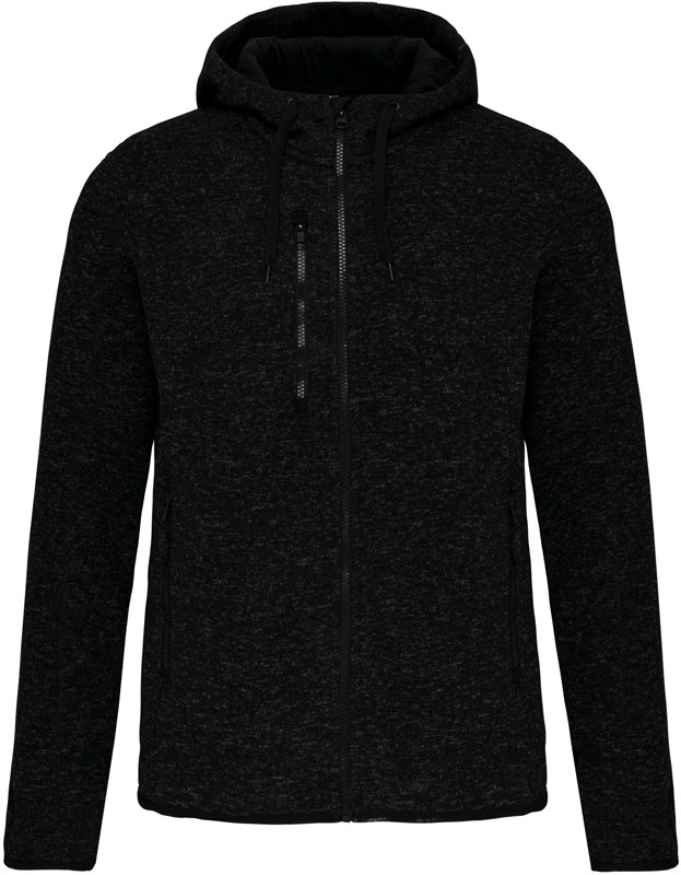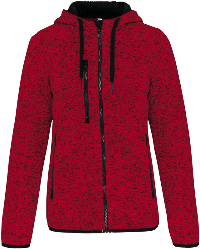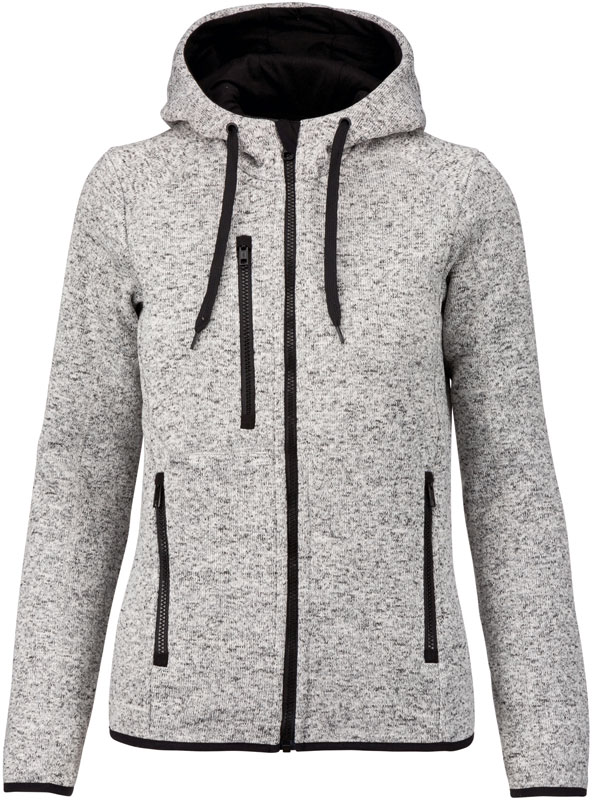 Damen Melange Kapuzen Strickfleece Jacke, Kapuze innen und Kordel in Kontrastfarbe, Ärmelbündchen und Saum in kontrastfarbenem Schrägband, Brusttasche, 2 Seitentaschen mit Reißverschluss, Überdecknaht an den Einsätzen, Reißverschlüsse in Kontrastfarbe, innen angeraut, 40° waschbar, nicht trocknergeeignet, nicht chemisch reinigen, Material: 345g/m², 100% Polyester, Kapuzenfutter: 100% Baumwolle, Single Jersey, Größen: XS,S,M,L,XL,XXL,3XL
