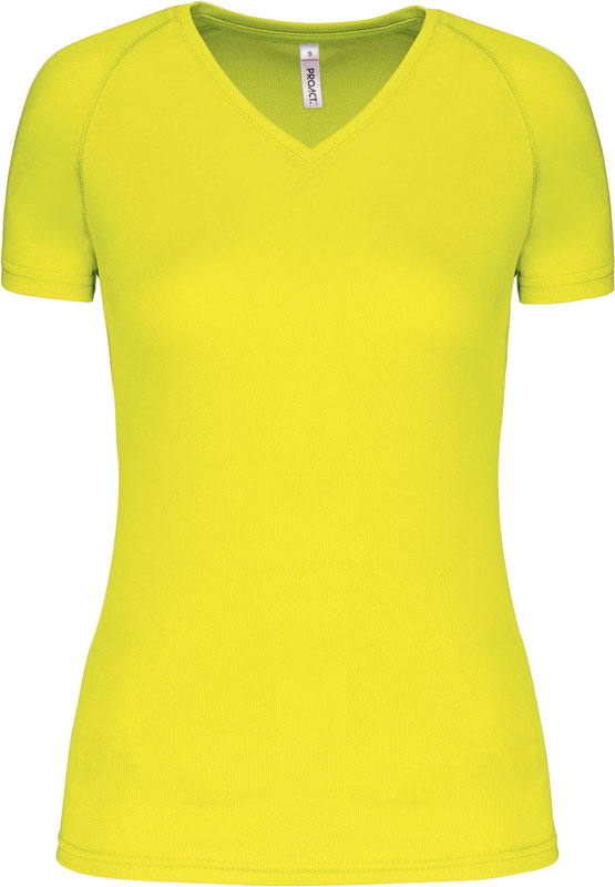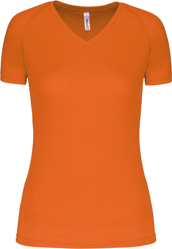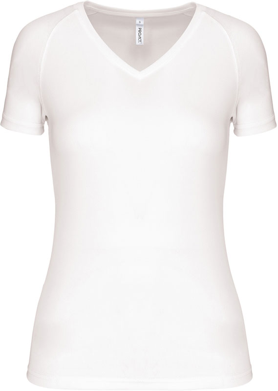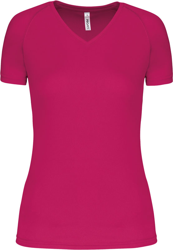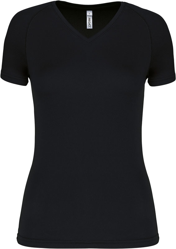 Damen V-Ausschnitt Sport T-Shirt, Taillierter Schnitt, atmungsaktiv und schnelltrocknend, kleiner V-Ausschnitt, Nackenband, Raglanärmel mit verdeckten Nähten, Doppelnähte an Ärmel und Bündchen, 40° waschbar, nicht trocknergeeignet, nicht chemisch reinigen, Material: 140g/m², 100% Polyester, Bird eye Gewebe, Größen: XS,S,M,L,XL