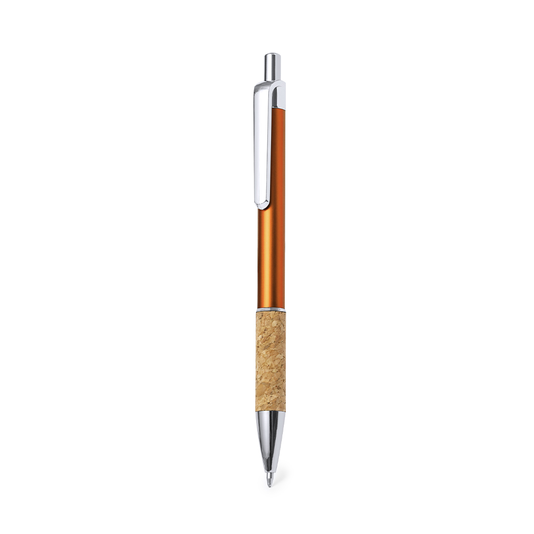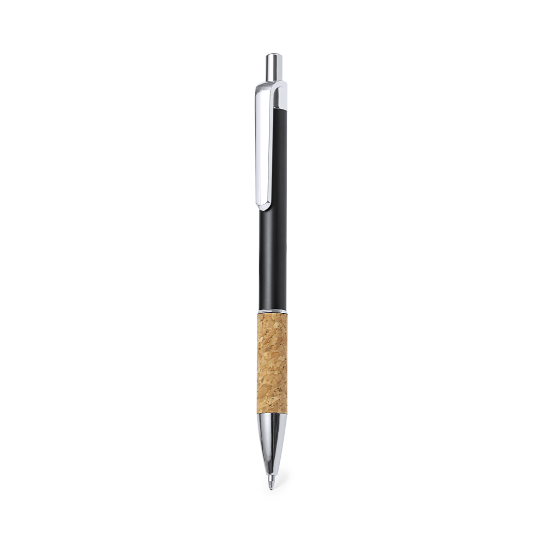 Stilvoller Kugelschreiber aus Kork und Aluminium mit Druckknopfmechanismus. Robuster Aluminiumschaft mit glänzender Oberfläche und Korkgriff, erhältlich in verschiedenen markanten Farben. Metallclip und blaue Tinte. Präsentiert in einem einzelnen recycelten Beutel.
