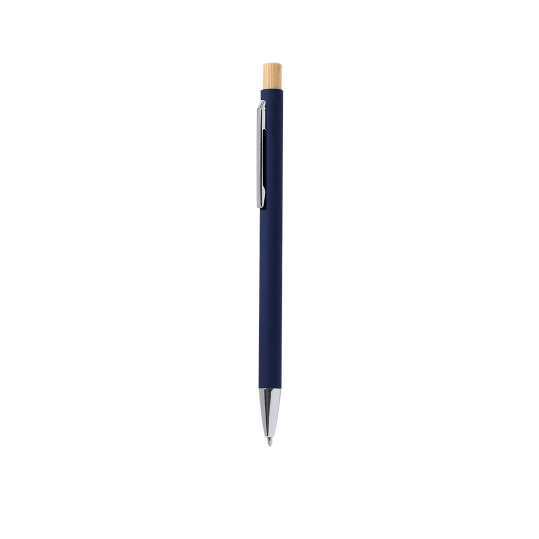 Kugelschreiber mit Druckmechanismus aus recyceltem Aluminium. Druckknopf aus Bambus und gummierter Oberfläche. Metallclip und recyclinggeprüftes Aluminium-Label auf der Oberseite des Kugelschreibers, in blauer Tinte.Recyceltes Aluminium ist ein Material mit nahezu unbegrenzten Recyclingmöglichkeiten, ohne dabei seine ursprünglichen Eigenschaften zu verlieren und bei geringerem Energieverbrauch in diesem Prozess.GRS-Zertifizierung (Global Recycled Standard), die den Recyclingursprung des verwendeten Materials zur Herstellung des Produkts gewährleistet.Materialien wie Bambus fördern die Nutzung natürlicher Rohstoffe und reduzieren die Schadstoffemissionen. Zudem stammt Bambus von einer widerstandsfähigen und vielseitigen Pflanze, die schnell wächst und sich regeneriert und somit eine hervorragende Alternative zur herkömmlichen Holzverwendung darstellt.Jumbo-Nachfüllung.