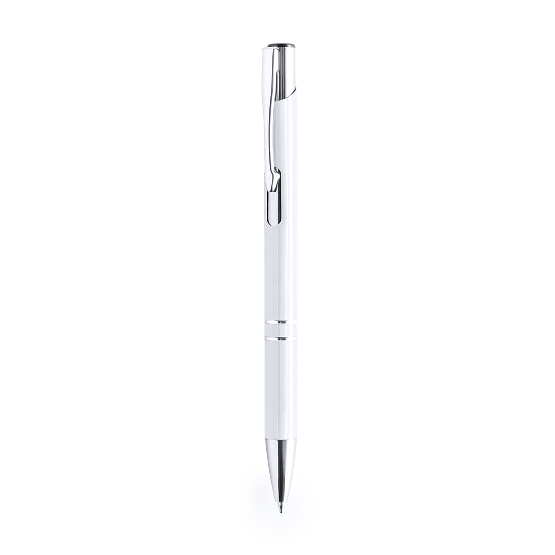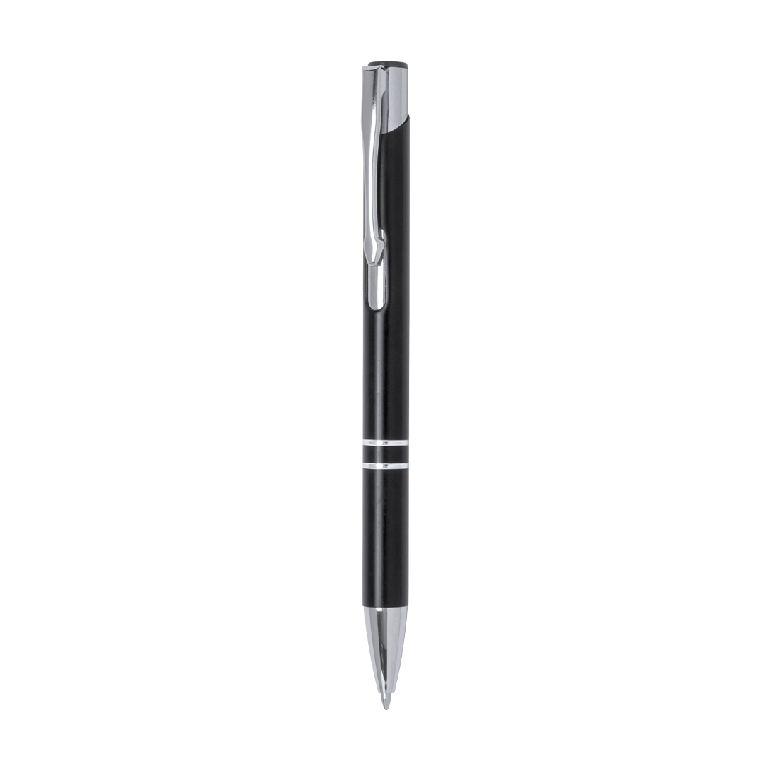 Druckknopfstift aus Aluminium. Enthält silberne Accessoires sowie passenden Clip, Druckknopf und Spitze. In schwarzer Tinte.
