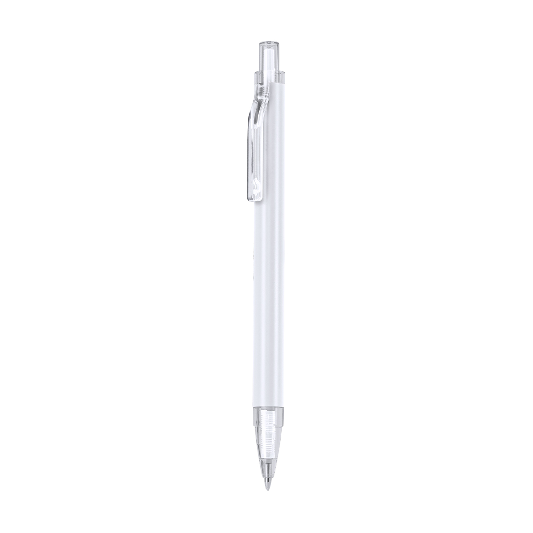 Stift mit Korpus aus recyceltem Aluminium. Clip, Knopfdruck, Spitze in transparenter Oberfläche. Jumbo-Ladung und mit blauer Tinte. Beinhaltet das Abzeichen von recyceltem Aluminium.